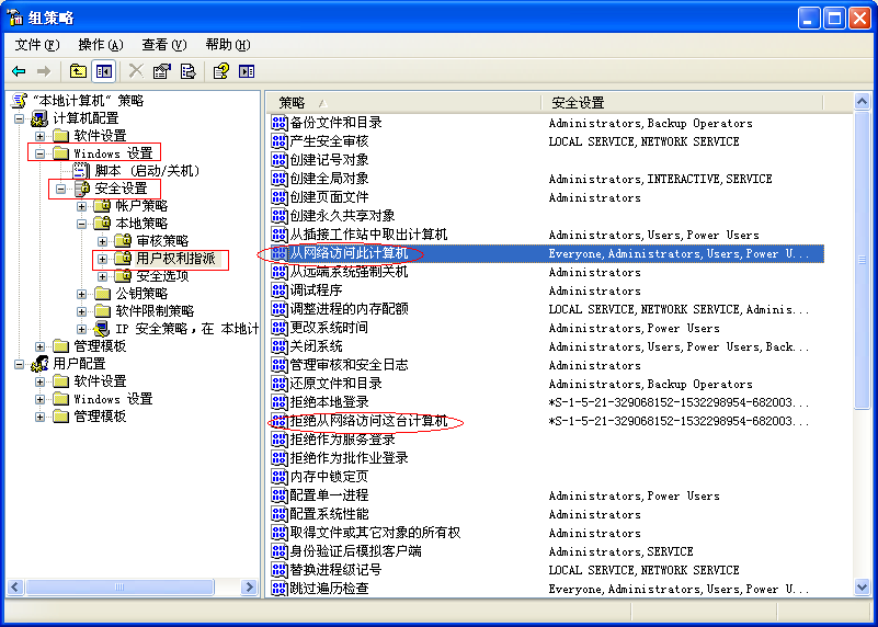 2.打開 組策略-計算機配置-windows設(shè)置-安全設(shè)置-本地策略-用戶權(quán)利指派中,將Guest賬戶添加到從網(wǎng)絡(luò)訪問計算機,拒絕從網(wǎng)絡(luò)訪問這臺計算機中將Guest賬戶刪除