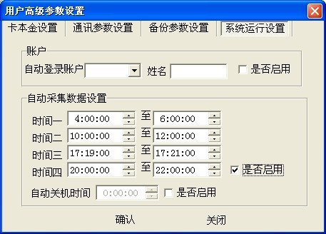 485一卡通軟件可以設(shè)置消費數(shù)據(jù)定時采集,如下圖所示,在用戶高級參數(shù)設(shè)置-系統(tǒng)運行設(shè)置中有一個自動采集數(shù)據(jù)設(shè)置,最多可以設(shè)置四個自動采集的時間段,時間段設(shè)置時不能跨天,且后一個時間段的開始時間不能大于前一時間段的結(jié)束時間,設(shè)置完成后勾選上是否啟用,點擊確認即可,如果沒有勾選上是否啟用,代表自動采集數(shù)據(jù)設(shè)置不起作用。