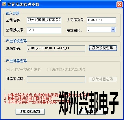 4) 系統(tǒng)密碼:跟卡的加密有關(guān),單擊【設(shè)置密碼】出現(xiàn)圖輸入卡的加密參數(shù)(根據(jù)公司所提供的信息填寫),單擊【獲取系統(tǒng)密碼】,單擊【保存配置】。將獲取的密碼粘貼到系統(tǒng)密碼后面的空白處。再次打開該窗口時可以單擊【讀取原始密碼】,獲得卡的加密信息。