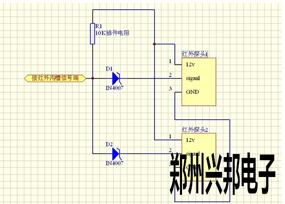 將每個(gè)二極管(IN4007)的負(fù)極和對(duì)應(yīng)的探頭信號(hào)端相連之后,再將每個(gè)二極管(IN4007)的正極擰到一起再與紅外溝槽的信號(hào)端相連。