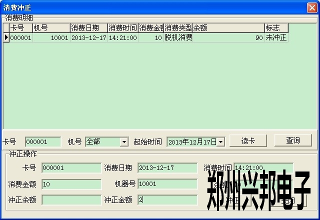 3. 點(diǎn)卡管理--消費(fèi)沖正,此時(shí)把多消費(fèi)的那張卡放到讀卡器上,然后點(diǎn)讀卡,此時(shí)會出現(xiàn)這天這張卡所有的消費(fèi)記錄,找到消費(fèi)多扣的那筆記錄,然后雙擊那筆記錄,此時(shí)下面就會出現(xiàn)這筆記錄的信息,然后把多消費(fèi)的金額在沖正金額那輸入即可。(如我這筆消費(fèi)記錄應(yīng)該是8元,但是按錯了按成10元,此時(shí)我可以沖正2元)