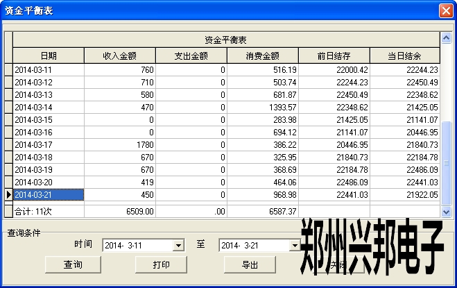 485軟件中資金平衡表是查詢指定日期的賬目情況,包括收入、支出、消費(fèi)和結(jié)余,統(tǒng)計(jì)時(shí)是按天統(tǒng)計(jì)的,顯示時(shí)也是按天顯示,一天一行,每一天都一個(gè)結(jié)存,當(dāng)日結(jié)余=收入金額-支出金額-消費(fèi)金額+前日結(jié)存,收入是指出納員每天的存款、收取的卡本金等,支出是指取款、退還卡本金、收繳舊卡的退款等,消費(fèi)金額是指每天的消費(fèi)總額,前日結(jié)存是指前一天的結(jié)余,每天的賬都是互相關(guān)聯(lián)的,若有一天的賬目不對(duì),會(huì)影響到以后的所有賬目,所以在結(jié)賬前要求必須將所有消費(fèi)數(shù)據(jù)都采集完畢。