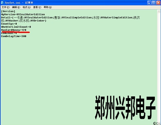 電腦桌面上找到485售飯機(jī)軟件圖標(biāo),然后光標(biāo)停在此軟件圖標(biāo)上右擊--屬性--查找根目錄,點開后打開軟件文件夾,也就是找到帶有軟件圖標(biāo)的文件夾,然后找到SYSSET.INI此文件,雙擊打開,把MAXCARDMONEY=XX,更改成自己所需要的即可,如下圖:有一卡通,售飯,水控,洗衣機(jī),飲水機(jī)等相關(guān)的中文數(shù)字,現(xiàn)在只需要把maxcardmoney=120,此時卡上總額最多只能存款為120,超過此金額就無法存款。