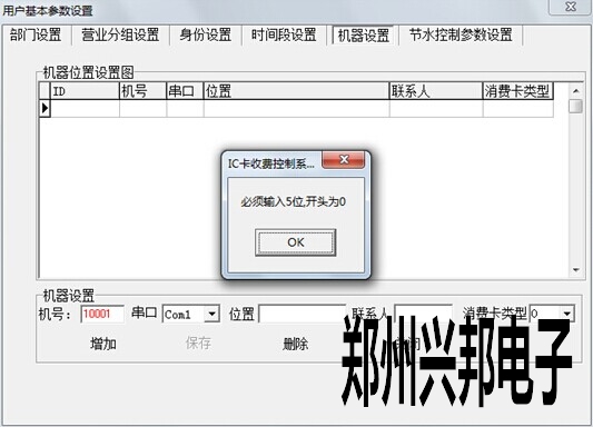 在軟件上添加水控機,售飯機相應的機器號:打開軟件,系統(tǒng)管理---用戶參數(shù)設置---用戶基本參數(shù)設置---機器設置,在機號那添加相應的機器號,例如10001就是1號機,串口選擇電腦所用的通訊串口。如下圖所示,圖中所用的通訊串口為COM1。但在極其特殊的情況下,會出現(xiàn)錯誤提示,機器號開頭為0。如圖所示。