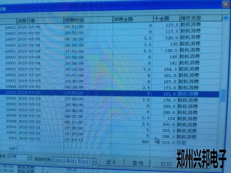 讓客戶在軟件里面查看一下個(gè)人明細(xì)表,選擇這張卡從開卡到現(xiàn)在的時(shí)間段,從下往上看,因采集的時(shí)候只顯示到分,沒(méi)有顯示到秒,所以看數(shù)據(jù)的時(shí)候要在同一日期的往上看一下,有的是沒(méi)有按順序排列的。像圖上所示的,所選擇的這一列應(yīng)該是比下面的這一列先消費(fèi)的。還有一條是10005號(hào)的對(duì)不上,5號(hào)機(jī)應(yīng)該是時(shí)間錯(cuò)誤了,這條應(yīng)該是3月3 號(hào)的消費(fèi)數(shù)據(jù)。把5號(hào)機(jī)校一下時(shí),下載一下參數(shù)就可以了。這種問(wèn)題就解決了。