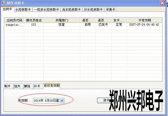 [文章內(nèi)容簡介]:IC卡食堂售飯機(jī)一卡通軟件,客戶在用一段時間后,再用出納員登錄,提示出納卡己過有效期。在出納卡這個界面你可以進(jìn)行制卡,掛失,解掛,補(bǔ)辦出納卡和修改出納卡的有效期