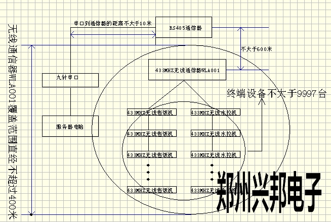 433MHZ無線通信器(WLA001)使用框圖如下所示,一個(gè)433MHZ無線通信器(WLA001)的無線覆蓋范圍為直經(jīng)400米(空曠地區(qū));只要在收發(fā)的范圍內(nèi),可連接的終端設(shè)備的臺數(shù)理論上沒有限制;地址號9998、9999,終端設(shè)備不可用,系統(tǒng)使用;
