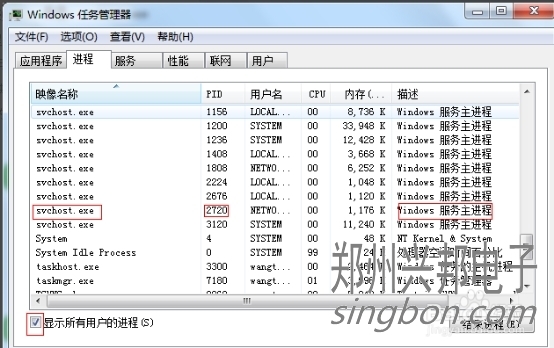 這樣我們就看到了PID這一列標(biāo)識(shí),看一下2720對(duì)應(yīng)的進(jìn)程是誰,如果沒有,我們把下面的顯示所有用戶的進(jìn)程前面的勾打上,就可以看到了,映像名稱是svchost.exe,描述是,Windows的主進(jìn)程,與上面命令查看的完全一致。