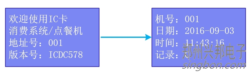 將消費機(jī)插上12V電源,開機(jī)時顯示版本號和機(jī)器號,最后轉(zhuǎn)入待機(jī)界面,顯示機(jī)器號、日期、時間界面。