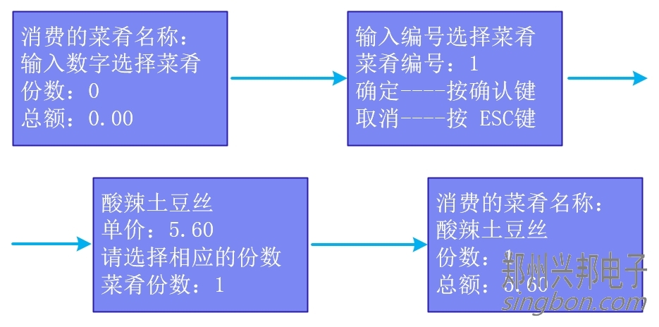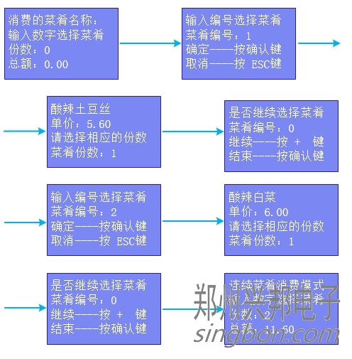 ③ 連續(xù)菜肴消費模式:輸入菜肴編號,點擊確認(rèn)后選擇份數(shù),點擊確認(rèn)后出現(xiàn)“是否繼續(xù)選擇菜肴,菜肴編號:0,繼續(xù)----按 +  鍵,結(jié)束----按確認(rèn)鍵”,點擊“+”號,輸入下一份菜肴編號,點擊確認(rèn)后選擇份數(shù),點擊確認(rèn)后出現(xiàn)是“是否繼續(xù)選擇菜肴,菜肴編號:0,繼續(xù)----按 +  鍵,結(jié)束----按確認(rèn)鍵”,點擊確認(rèn),出現(xiàn)消費的份數(shù)、總額,將卡片放于刷卡區(qū),即可進(jìn)行扣費,扣費后顯示扣費金額、手續(xù)費用、卡上余額、卡號,操作流程如下圖所示: