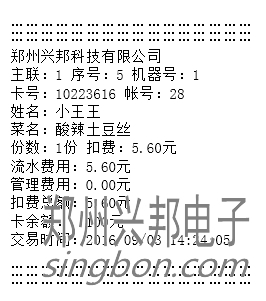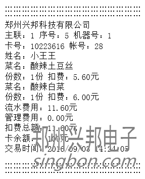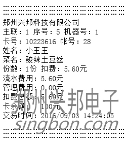 3) 自動消費模式:最多可設(shè)置8個費率,每個費率可設(shè)置對應(yīng)的菜肴、份數(shù),將費率設(shè)置好之后在自動模式下輸入相應(yīng)的費率編號放卡即可自動扣除相應(yīng)費用。只有計算和自動模式可以用,計算模式只作為查看使用,不能扣費。若連接的有打印機(jī),可打印消費明細(xì),打印出來的消費明細(xì)格式如下圖所示: