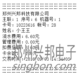 ② 計算模式:輸入扣費金額,按[確認(rèn)]鍵后,將卡片放于刷卡區(qū),即可進(jìn)行扣費,若連接的有打印機(jī),可直接打印消費明細(xì),打印出的信息如下圖所示: