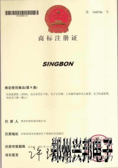 2011年11月,興邦電子獲得國家工商管理總局頒發(fā)的(SINGBON)商標注冊證書,有效期10年。